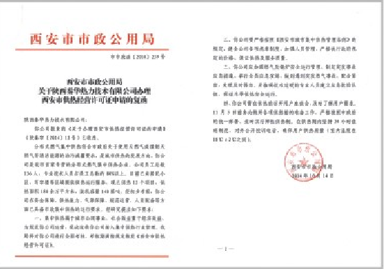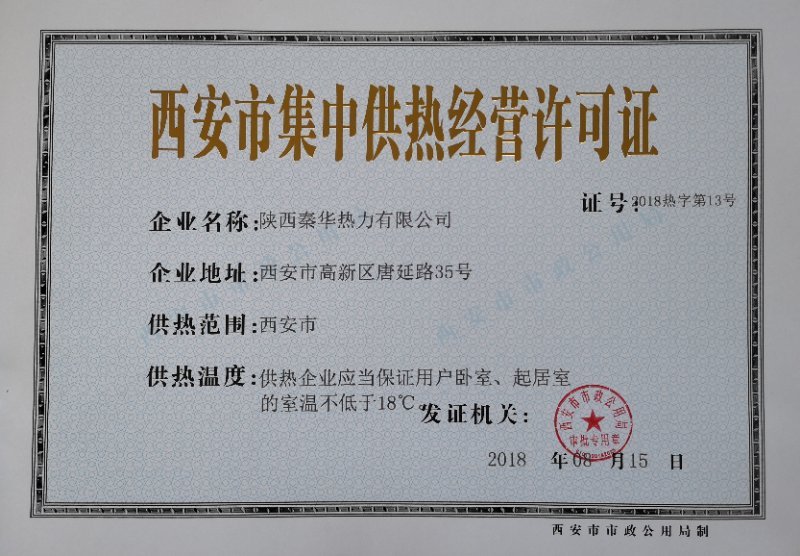 西安市政府頒發《西安市供熱經營許可證》